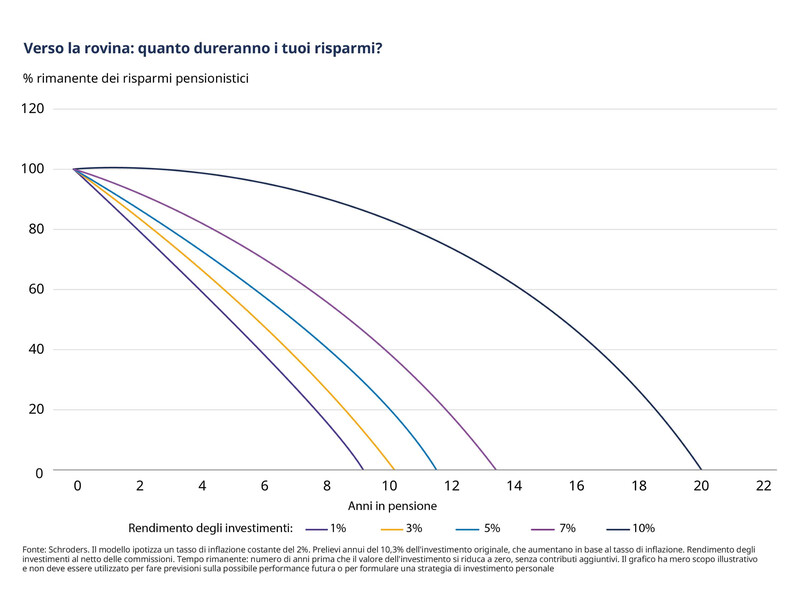 Il grafico seguente, ricavato dalle analisi di Schroders, mostra gli effetti di un prelievo del 10,3% su un portafoglio.