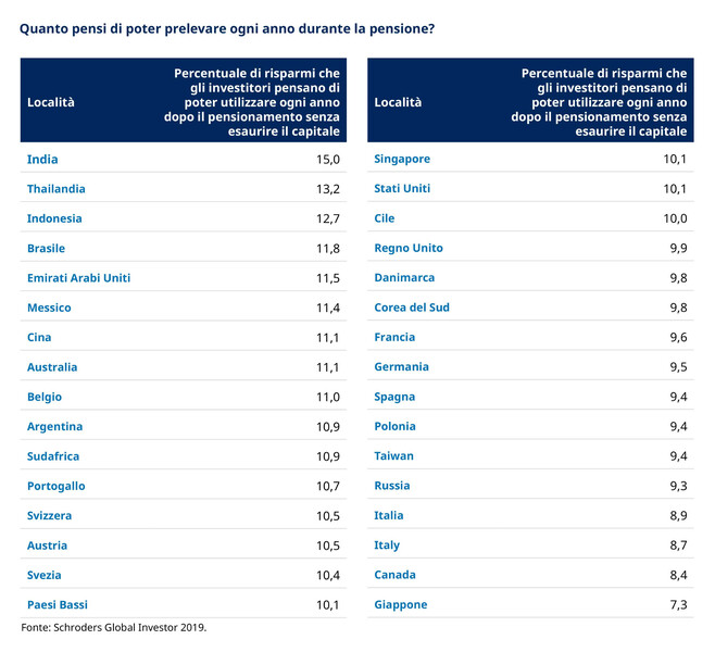 Il Global Investor Study 2019 di Schroders ha evidenziato delle differenze a livello geografico circa l'importo medio che gli investitori ritengono di poter prelevare ogni anno dai propri risparmi pensionistici senza esaurire il capitale. Gli investitori indiani hanno indicato la percentuale più elevata (15,0%); quelli giapponesi la più bassa (7,3%).