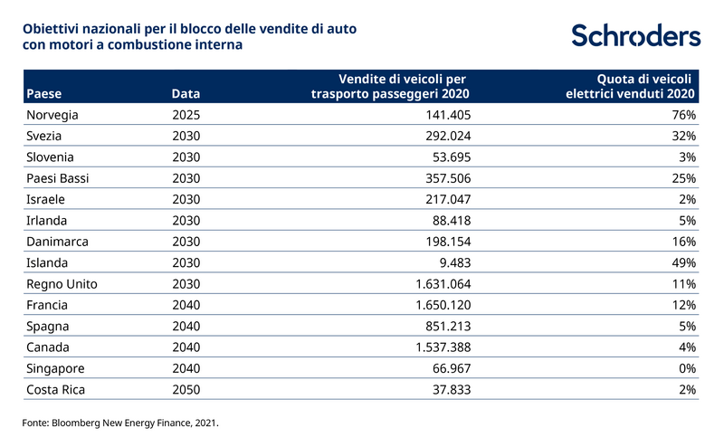 Le vendite di veicoli elettrici (VE) quest'anno sono state davvero eccezionali. In 12 mesi, fino a giugno 2021, sono cresciute di oltre il 160% e del 130% rispetto all'anno ancora precedente (dati BNEF). Lo abbiamo evidenziato nell’ultimo aggiornamento di Schroders Climate Dashboard.