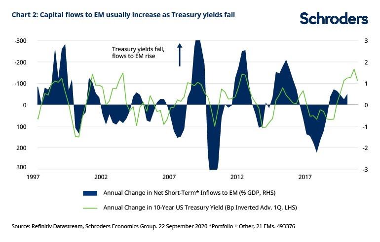Fonte: Refinitiv Datastream, Schroders Economics Group. Dati al 22 settembre 2020. I flussi netti a breve termine verso i mercati emergenti (short-term inflows) rappresentano la somma dei flussi di portafoglio verso i bond e le azioni emergenti e di ?altri' flussi, prevalentemente di origine bancaria.