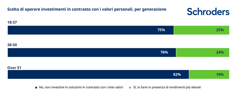 Rispettivamente il 75% e il 76% degli appartenenti alla categoria 18-37 anni e alla generazione X (38-50 anni) non prenderebbe decisioni di investimento in contrasto con i propri principi, mentre l'82% degli over 51 non anteporrebbe rendimenti più elevati ai valori personali.