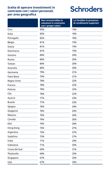 All'estremo opposto si collocano gli investitori di Stati Uniti e Singapore: un terzo degli intervistati infatti prenderebbe decisioni di investimento in contrasto con i propri principi per ottenere rendimenti più elevati.