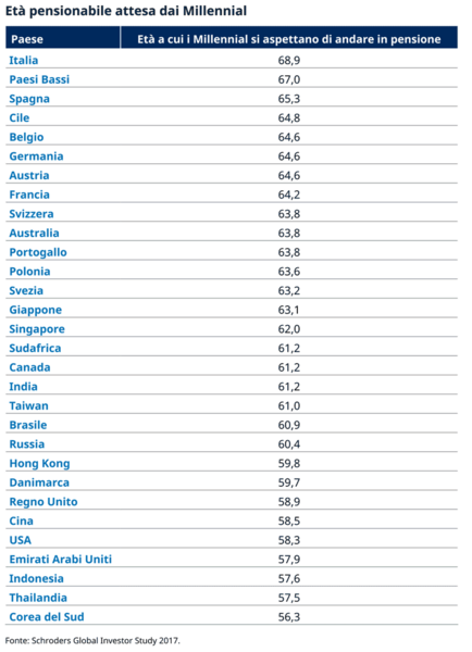 L'indagine, condotta su 22.000 investitori di 30 Paesi, mostra inoltre che i Millennial sperano di andare in pensione in media a 58,2 anni.