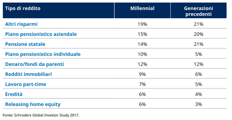 Dalla ricerca Schroders Global Investor Study emerge che i Millennial (18-35 anni) investono l'11,2% dello stipendio in vista della pensione, e fanno meno affidamento su quanto riceveranno dallo Stato rispetto alle generazioni precedenti (over 35).