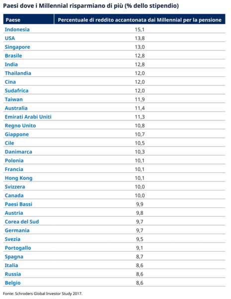 Secondo Schroders Global Investor Study, in media i Millennial mettono da parte l'11,2% del loro reddito per la pensione. Le generazioni più anziane accantonano leggermente di più (11,6%).