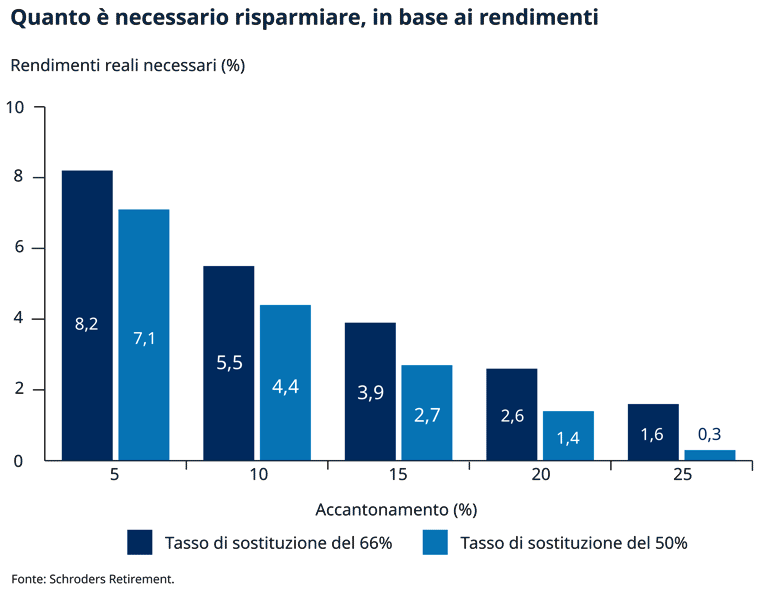 Il grafico seguente mostra i rendimenti necessari per raggiungere determinati risultati secondo le analisi di Schroders.