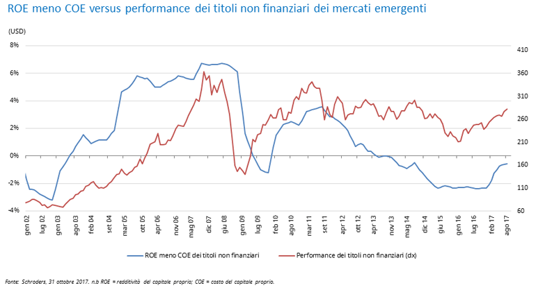 Il ciclo dei rendimenti ha toccato il minimo e si assiste ora a una ripresa del ROE. Tale dinamica è sostenuta da migliori condizioni economiche, associate ai precedenti interventi aziendali su capex e efficienza operativa. Abbiamo inoltre visto una svolta nei cicli creditizi di alcuni paesi emergenti, di norma pluriennali.