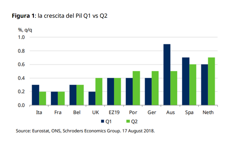 Sebbene il Pil di alcuni degli Stati membri più grandi sia salito, la crescita debole in Italia e Francia ha pesato sul dato complessivo e anche Austria e Spagna hanno registrato dei rallentamenti. In Germania la lettura è migliorata rispetto ai primi tre mesi dell’anno, ma i nuovi ordini industriali sono diminuiti, segnalando prospettive poco rosee per il contributo delle esportazioni nette alla crescita del Pil.