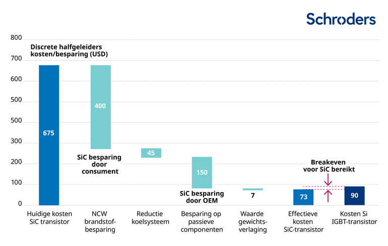 Het grootste nadeel van deze materialen tot nu toe zijn de productiekosten, die een stuk hoger zijn dan bij silicium-gebaseerde componenten. De kosten zijn echter al aan het dalen, en zullen verder zakken naarmate de volumes toenemen. Het meest kansrijke materiaal voor hoogvermogenstoepassingen, zoals elektrische voertuigen (EV’s), is waarschijnlijk siliciumcarbide, dat het vermogensverlies in de omvormer met 70-80% kan verminderen. Het onderstaande voorbeeld laat zien dat het totale kostenplaatje, inclusief de stroombesparing door de consument, deze componenten nu kansrijk begint te maken voor toepassing in EV’s.