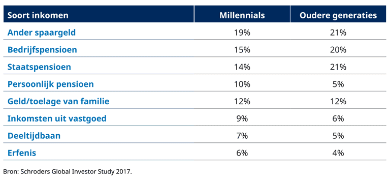 Millennials gaan er nog steeds van uit dat het staatspensioen, bedrijfspensioenen en ander spaargeld de grootste bijdrage aan hun pensioeninkomsten zullen leveren, maar verwachten er veel minder van dan oudere generaties.