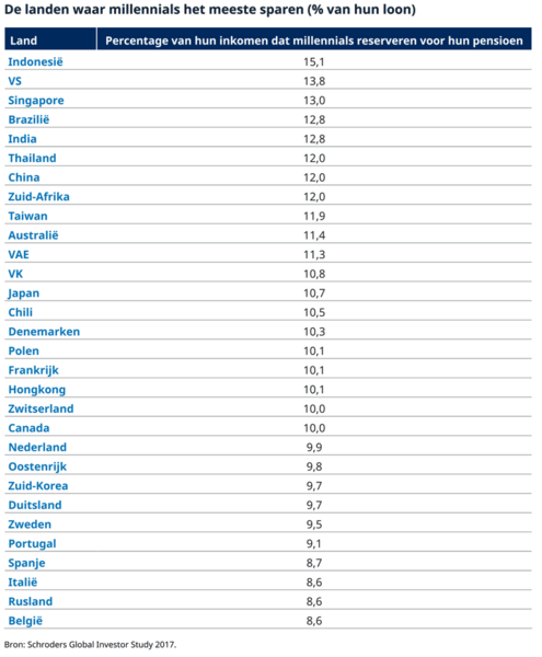 Volgens de Schroders Global Investor Study zetten millennials gemiddeld 11,2% van hun inkomen opzij voor hun pensioen. De oudere generaties sparen iets meer: 11,6%.