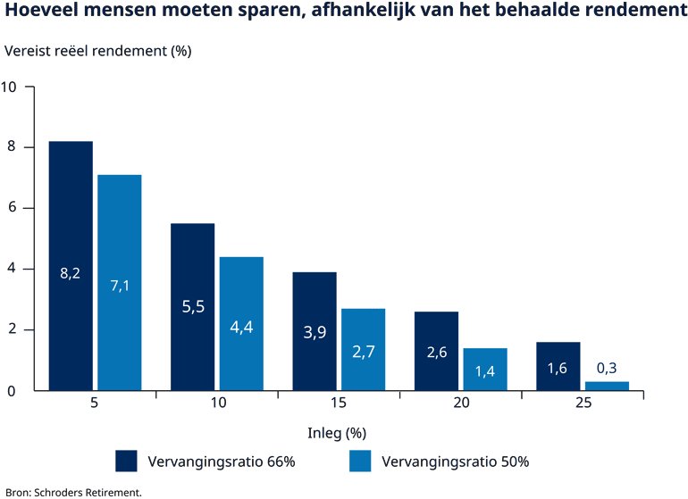 De onderstaande grafiek toont de rendementen die volgens berekeningen van Schroders nodig zijn om bepaalde uitkomsten te bereiken.
