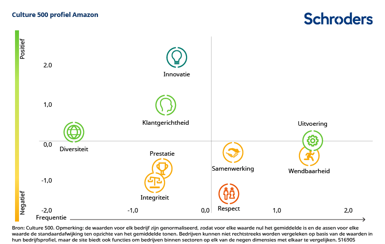 De onderstaande grafiek bijvoorbeeld laat de resultaten zien voor Amazon: het zal weinigen verbazen dat het bedrijf hoog scoort op innovatie, maar wordt bekritiseerd wegens gebrek aan respect. Dit sluit aan bij de verhalen in de media en van klokkenluiders over de behandeling van magazijnmedewerkers.