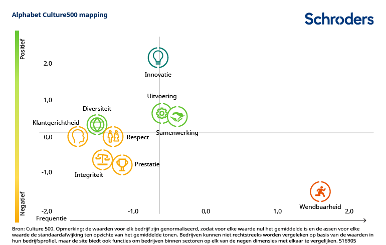 Bij Alphabet staat tegenover de positieve opmerkingen over innovatie een verrassend negatieve score voor wendbaarheid. Het scoort in het algemeen hoger op waarden als respect, diversiteit en samenwerking dan Amazon, wat enigszins geruststelt gezien de onrust van enkele jaren geleden over discriminatie. Interessant is dat integriteit in de hele big tech sector minder vaak wordt genoemd dan in andere sectoren.