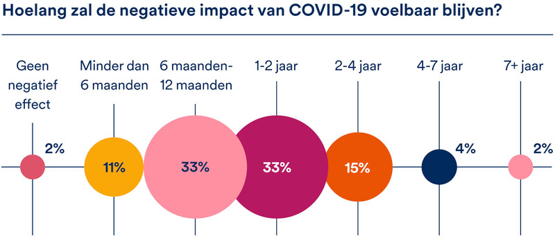Nederlanders houden relatief vaker rekening met een lange herstelperiode: 37% denkt dat de negatieve economische impact van Covid-19 1 tot 2 jaar zal aanhouden en 20% denkt zelfs dat het 2 tot 4 jaar zal duren voordat er normalisering optreedt. Daarmee zijn Nederlandse beleggers duidelijk negatiever dan het wereldwijde gemiddelde (33 respectievelijk 15%). Wereldwijd denkt 6 procent dat de impact van Covid-19 meer dan 4 jaar voelbaar zal blijven, in Nederland ligt dat één procentpunt hoger. De herstelperiode wordt door de Nederlandse ondervraagden gemiddeld ingeschat op 1,95 jaar.
