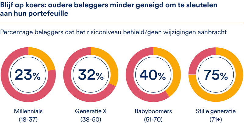 Leeftijd or ervaring - of beide - lijken duidelijk een rol te spelen in de manier waarop beleggers reageren op volatiliteit. Millennials (tussen 18 en 37 jaar) waren bijna twee keer zoveel geneigd om hun portefeuilles aan te passen dan hun ouders, de babyboomers (51-70 jaar), zo leert het onderzoek. De oudste beleggers, de 71-plussers, waren het minst geneigd om van koers te veranderen.