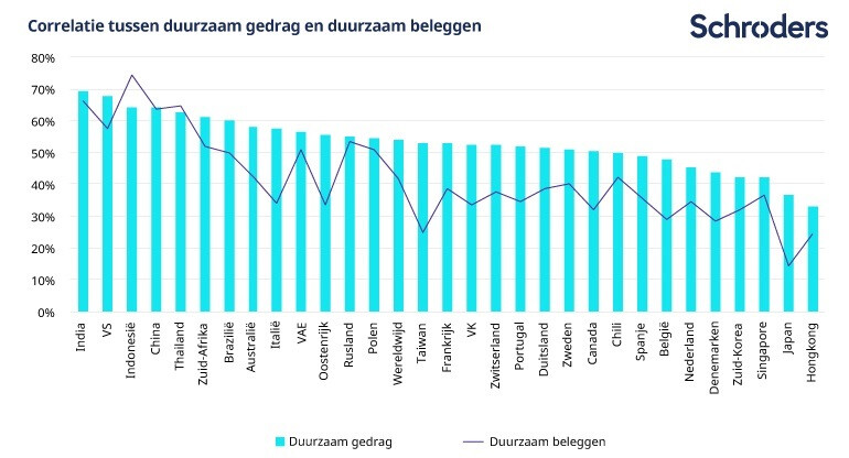 Een voorbeeld: een hoog percentage van de Indiase en Amerikaanse beleggers met een duurzame leefstijl belegt ook duurzaam. In Japan en Hongkong daarentegen zijn beleggers minder geneigd zich duurzaam te gedragen en duurzaam te beleggen.