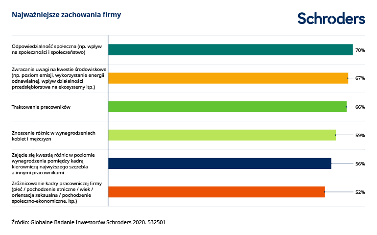 KD: "Zaczynamy nazywać to nowym kontraktem społecznym, w tym sensie, że miejsce firmy w jej społeczności i szerszym społeczeństwie się zmienia. Jest to ważne również dla klientów. Tegoroczne Globalne Badanie Inwestorów firmy Schroders pokazało, w jaki sposób ludzie oczekują od firm priorytetowego traktowania działań, które mają wpływ na środowisko i społeczeństwo".