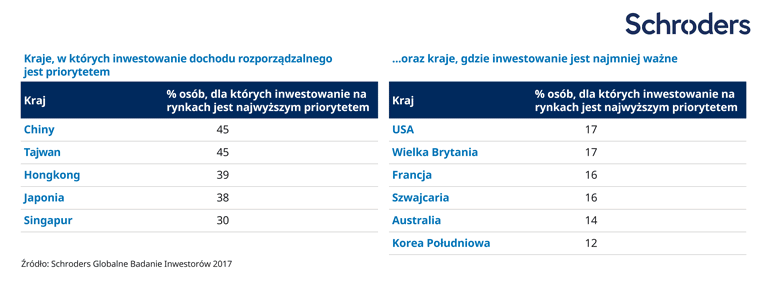 Ważne informacje: Schroders zlecił firmie Research Plus Ltd przeprowadzenie w okresie od 1 do 30 czerwca 2017 r., niezależnego badania online obejmującego 22 100 inwestorów z 30 krajów na całym świecie, w tym z Australii, Brazylii, Kanady, Chin, Francji, Niemiec, Indii, Włoch, Japonii, Holandii, Hiszpanii, ZEA, Wielkiej Brytanii oraz ze Stanów Zjednoczonych. To badanie definiuje "inwestorów" jako osoby, które będą inwestowały minimum 10 000 € (lub równowartość tej kwoty) w ciągu 12 miesięcy i którzy na przestrzeni minionych 10 lat dokonali zmian w swoim portfelu. W niniejszym dokumencie wyrażono własne opinie i poglądy spółki Schroders, które mogą ulec zmianie. Niniejszy dokument ma wyłącznie charakter informacyjny i w żadnym aspekcie nie stanowi materiału promocyjnego. Nie stanowi on także oferty ani zachęty do kupna lub sprzedaży jakiegokolwiek instrumentu finansowego. Niniejszy dokument nie ma na celu i nie powinien być traktowany jako rekomendacja w kwestiach księgowych, prawnych, podatkowych czy inwestycyjnych. Nie należy opierać się na poglądach i informacjach zawartych w niniejszym dokumencie przy podejmowaniu indywidualnych decyzji inwestycyjnych i/lub strategicznych. Historyczne stopy zwrotu nie stanowią gwarancji osiągnięcia podobnych wyników i mogą nie być powtórzone w przyszłości. Wartość inwestycji oraz dochody z nich czerpane mogą spadać bądź rosnąć, a inwestorzy mogą nie odzyskać pierwotnie zainwestowanych kwot. Wszystkie inwestycje wiążą się z ryzykiem, w tym z możliwością straty wpłaconego kapitału. Według najlepszej wiedzy zawarte tu informacje są wiarygodne, jednak Schroders nie gwarantuje ich kompletności ani dokładności. Nie należy opierać się na poglądach i informacjach zawartych w niniejszym dokumencie przy podejmowaniu indywidualnych decyzji inwestycyjnych i/lub strategicznych. Dane dotyczące regionów i sektorów zostały przedstawione jedynie w celach ilustracyjnych i nie powinny być postrzegane jako rekomendacja kupna lub sprzedaży instrumentów finansowych. Na terytorium Ameryki Północnej, niniejsza treść jest wydawana przez Schroder Investment Management North America Inc., spółkę pośrednio w całości zależną od spółki Schroders plc, zarejestrowanego w SEC doradcy, dostarczającego produkty i usługi zarządzania aktywami klientom z USA i Kanady. Dla wszystkich pozostałych wydawcą dokumentu jest spółka Schroder Investment Management Limited, 31 Gresham Street, Londyn EC2V 7QA. Numer rej.: 1893220 Anglia. Autoryzacja od Financial Conduct Authority, będącego organem regulacyjnym.