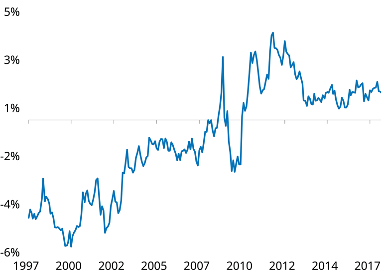 Źródło: Schroders/Credit Suisse Grudzień 2017 r. Historyczne wyniki nie są wskazówką odnośnie tych, które mogą zostać osiągnięte w przyszłości i mogą się nie powtórzyć
