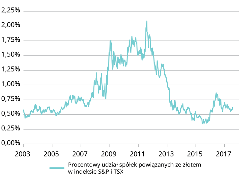 Jeśli patrzymy obecnie na spółki powiązane ze złotem, to dostrzegamy podobny obraz. Bieżący udział północnoamerykańskich spółek powiązanych ze złotem w indeksie S&P500 i TSX spadł do zaledwie 0,6% po osiągnięciu 2% szczytu w 2012 r. W rzeczywistości wszyscy producenci złota z Ameryki Północnej (USA i Kanady) posiadają łącznie kapitalizację rynkową niższą niż 150 mld USD. To podkreśla przestrzeń do wzrostu wartości spółek powiązanych ze złotem, jeżeli rynek byka na kruszcu się rozpocznie.