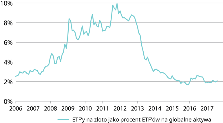 Chociaż w 2017 r. mieliśmy do czynienia ze wzrostem cen zarówno złota jak i srebra, to złoto pozostaje niedoważaną klasą aktywów. Pozytywny cykl inwestycyjny dla tej klasy aktywów potencjalnie może mieć wiele lat. Obecny udział ETF-ów (exchange-traded fund) na złoto w ETF-ach na globalne aktywa jest niewielki. Jak pokazuje poniższy Wykres nr 2, w 2012 r. złoto cieszyło się relatywnie większą popularnością. ETF'y oparte na złocie stanowiły ponad 10% ETF'ów na wszystkie klasy aktywów (włączając akcje, obligacje, itd).