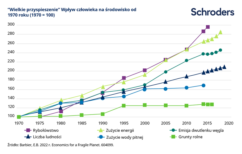 Jak wynika z powyższego wykresu, wpływ człowieka na środowisko naturalne przyspiesza w niepokojącym tempie. Tematy dotyczące ograniczeń w obszarze bioróżnorodności i zasobów naturalnych będą w coraz większym stopniu poddawane segmentacji.