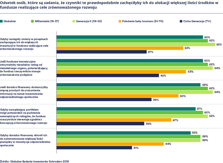 Tuż za nimi wymieniono dostęp do łatwo zrozumiałej informacji od ich doradcy finansowego (59%) oraz lokalne ratingi, które identyfikują fundusze inwestujące w sposób zrównoważony (57%). Niewiele mniej ma najmniej popularny wybór, czyli zachęta ze strony doradców finansowych do inwestowania zrównoważonego (55%).