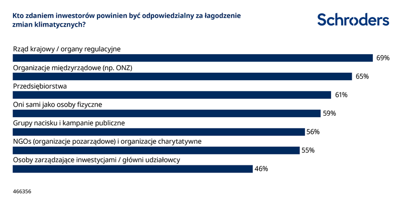 Badanie Schroders wskazało, że 69% osób uważa, że rządy krajowe i organy regulacyjne są odpowiedzialne za łagodzenie zmian klimatycznych, a ponad połowa (59%) sądzi, że powinny być za to odpowiedzialne również osoby indywidualne.