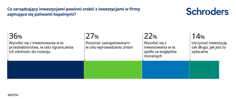 Nieco ponad jedna trzecia (36%) stwierdziła, że zarządzający powinni wycofać się z inwestycji w firmy działające w branży paliw kopalnych, aby ograniczyć ich możliwości rozwoju. Jednak ponad jedna czwarta (27%) respondentów stwierdziła, że zarządzający powinni utrzymać inwestycję, aby napędzać zmiany, a 14% stwierdziło, że powinni utrzymać inwestycję do czasu, gdy pozostaje ona opłacalna.