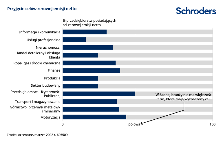 Jednak, jak pokazuje poniższy wykres, nie ma takiej branży, w której większość przedsiębiorstw przyjęłaby do tej pory cele zerowej emisji netto. Zero netto oznacza ograniczenie emisji gazów cieplarnianych do poziomu jak najbardziej zbliżonego do zera. Aby utrzymać globalne ocieplenie na poziomie nie wyższym niż 1,5°C - do czego wzywa Porozumienie Paryskie - należy ograniczyć emisje o 45% do 2030 r., a do 2050 r. osiągnąć poziom zerowy netto.