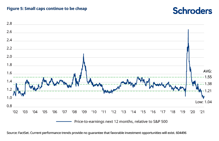 US small caps are currently trading at a price-earnings discount relative to US large caps.