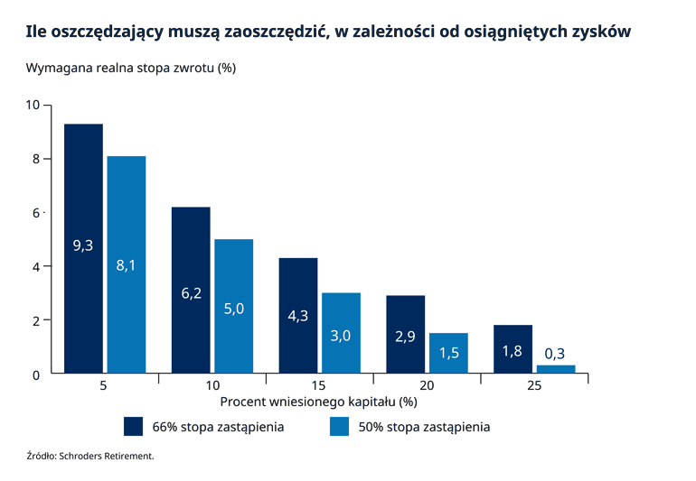 Wykres poniżej przedstawia analizy przeprowadzone przez firmę Schroders. Założono, że rozpoczęcie oszczędzania następuje w wieku 30 lat, a wynagrodzenie wynosi 35.000 funtów i wzrasta zgodnie z inflacją. Na wykresie zaprezentowano realne roczne stopy zwrotu (uwzględniające inflację), które są niezbędne do uzyskania dwóch poziomów dochodów: 50% albo 66% pensji, po przejściu na emeryturę. Są to typowe przedziały, do których ludzie dążą. Założono również, że korzystają z pieniędzy średnio przez okres 18 lat.