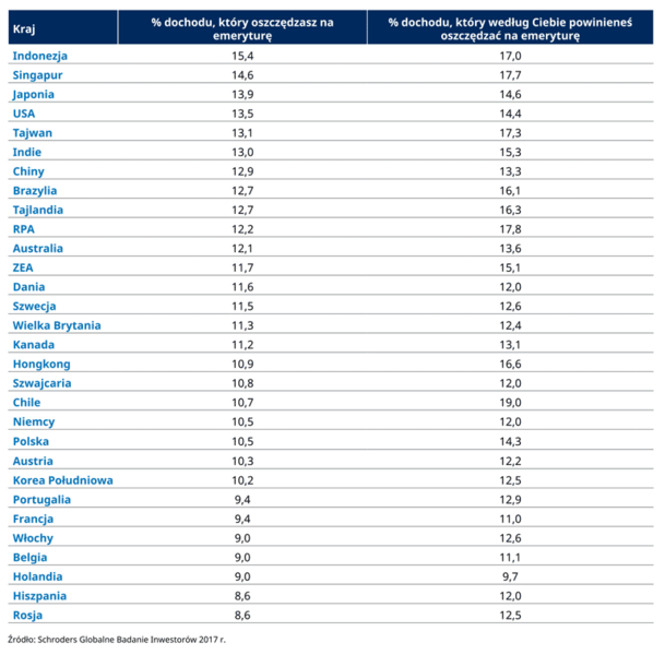 Globalnie 66% inwestorów, którzy przeszli na emeryturę wskazuje, że gdyby mogło oszczędzałoby więcej na swoją emeryturę. Niemniej jednak inwestorzy, którzy nie przeszli jeszcze na emeryturę przyznali, że powinno oszczędzać więcej. Są zdania, że powinni inwestować średnio 13,7% swojego dochodu, aby móc żyć komfortowo na emeryturze. To więcej niż średnio 11,4%, które obecnie na te cele inwestują.