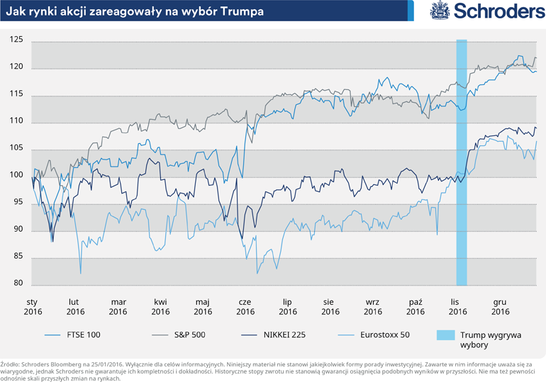 Rynki akcji notowały znaczące wzrosty, a niektóre z nich osiągnęły szczyty wszechczasów. Zwyżki miały początek w momencie zwycięstwa Trumpa w prezydenckim wyścigu, wraz z oczekiwaniami inwestorów na ożywienie amerykańskiej gospodarki i dalsze rozprzestrzenianie się tego efektu.
