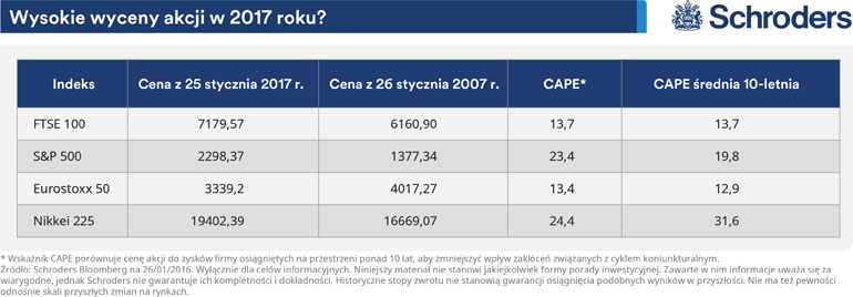 Wyceny FTSE 100 i Eurostoxx 50 są na poziomach ich długoterminowych (10-letnich) średnich z punktu widzenia wskaźnika CAPE (cyklicznie dostosowany wskaźnik ceny do zysku, ang. cyclically adjusted price-to-earnings) wynoszących odpowiednio 13,7x i 13,4x.