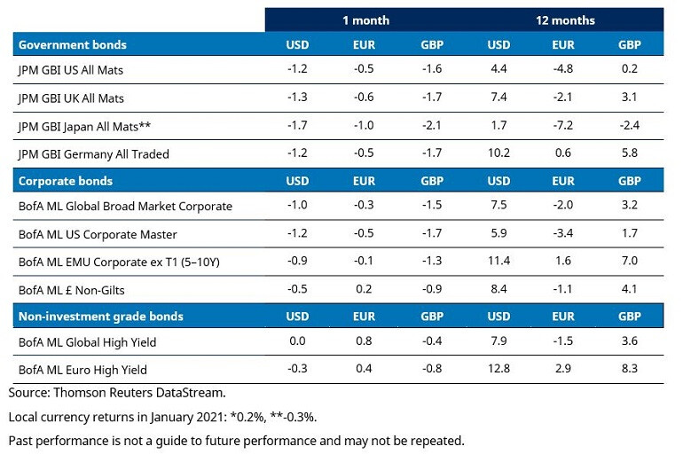 - Government bond yields generally rose (meaning prices fell). In the US, the Democrats secured control of Congress to raise expectations of more fiscal stimulus.