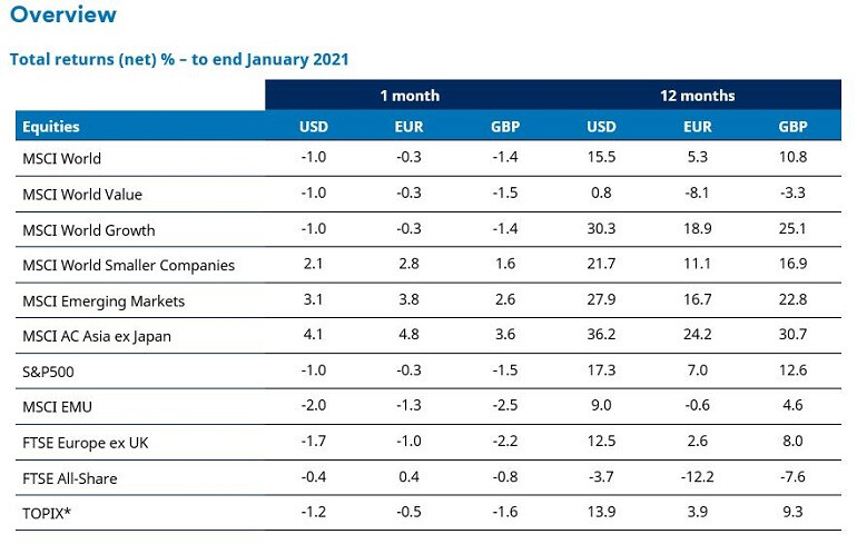 An overview of markets in January when emerging market equities outperformed their developed market peers.