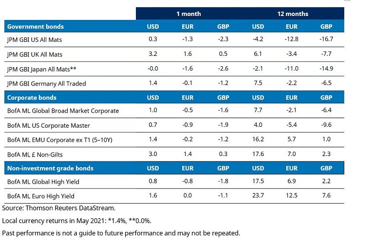 - Government bond yields were little changed in May. US investment grade corporate bonds produced a solid total return and continued outperforming Treasuries.
