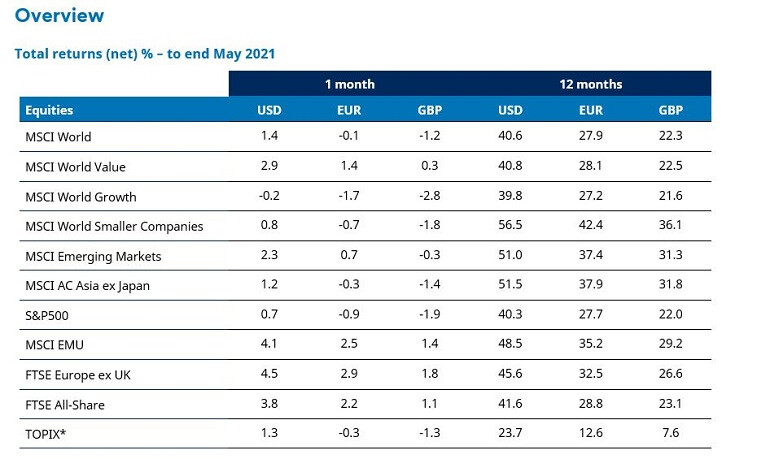 - Developed market equities gained in May with the ongoing vaccine roll-outs and fiscal stimulus measures helping to offset concerns about rising inflation. Emerging market shares also advanced, aided by US dollar weakness.