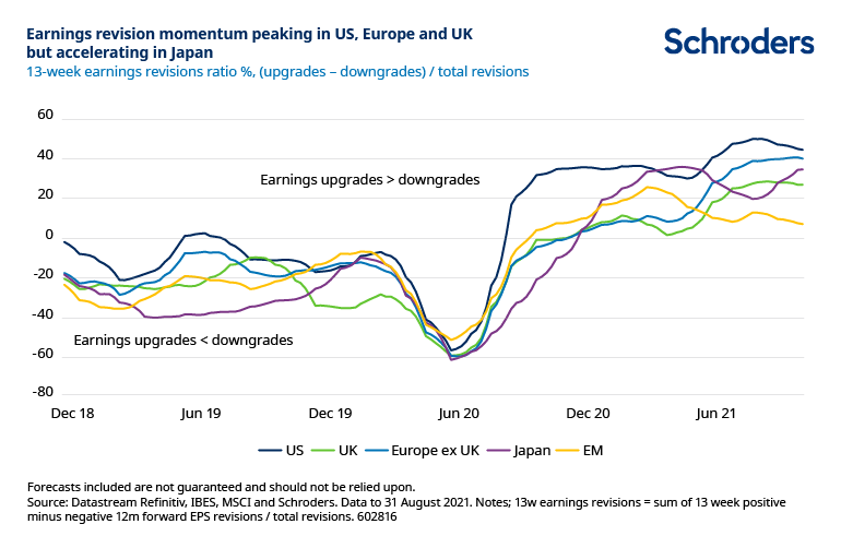 Overall, the Japanese market is one where earnings momentum is still accelerating, compared to other regions where upward revisions may have peaked as the chart below shows. This corresponds to the path of Japan’s slower vaccine roll-out and longer-lasting restrictions.