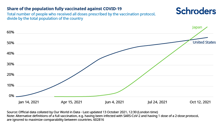 The pick-up in the pace of vaccinations means Japan was able to lift its state of emergency - which covered most of the population - at the end of September. While Japan has benefited from the broader global economic recovery this year, we should now start to see the domestic economy re-open and recover.