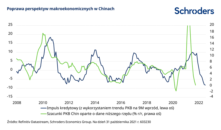 Będziemy również poszukiwać optymizmu w wiodących wskaźnikach ekonomicznych w celu znalezienia oznak dalszej poprawy. Dla przykładu, choć w październiku 2021 r. impuls kredytowy - 12-miesięczna zmiana wartości nowych kredytów w stosunku do PKB - nadal spadał, sygnalizując pogorszenie warunków gospodarczych w letnich miesiącach 2022 r., to jednak miało to miejsce w wolniejszym tempie. Impuls ten może ulec spowolnieniu i nasilić się na przełomie roku, sugerując poprawę aktywności w drugiej połowie 2022 r.
