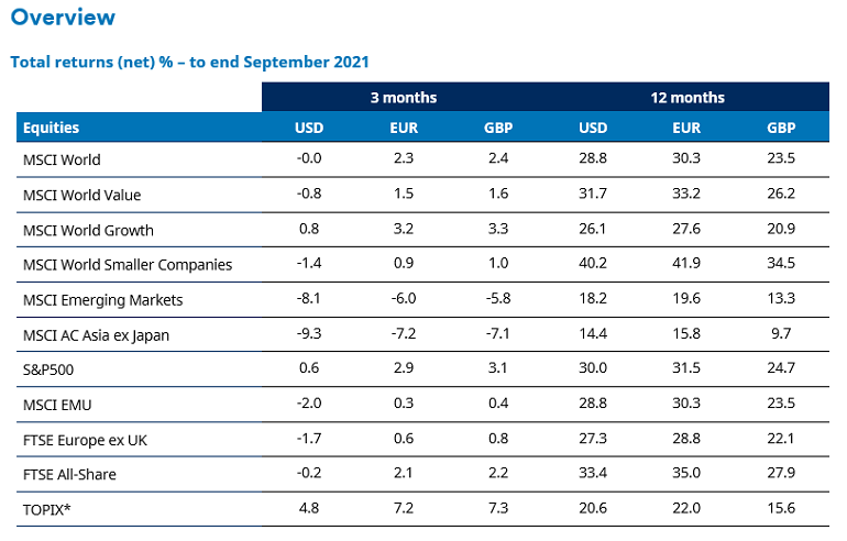 On a sector basis, financials and utilities outperformed. At the other end of the spectrum, industrials and materials struggled, although September’s sell-off hit almost all sectors. Energy was an exception, rising as supply constraints drove prices to highs – particularly Brent crude.