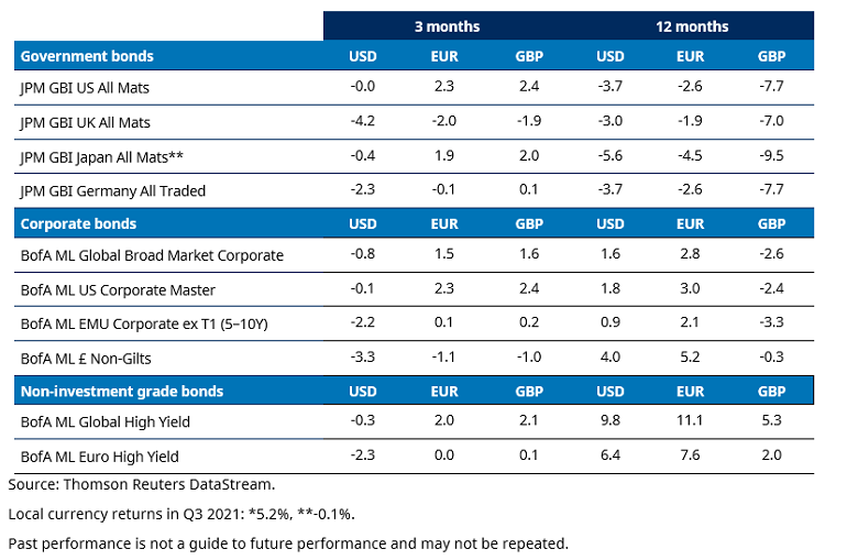 US and European government yields were unchanged for the quarter as an initial decline reversed in September amid a hawkish shift from central banks and continuing inflationary pressure. The UK underperformed, with a significant rise in yields on increased expectations for monetary policy tightening.