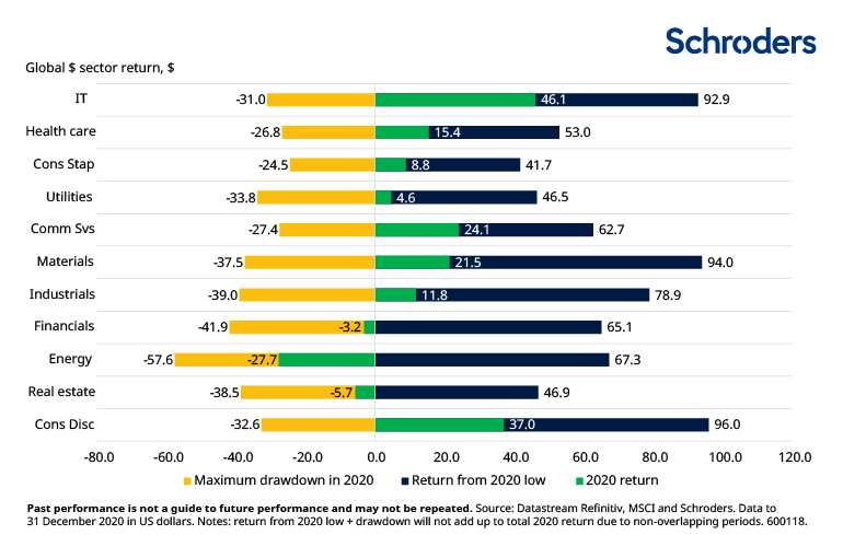 Many of the sectors that suffered deep drawdowns earlier in the year made a substantial comeback. The extraordinary monetary stimulus pumped by central banks around the world combined with market optimism for a Covid-19 vaccine underpinned much of the rebound.