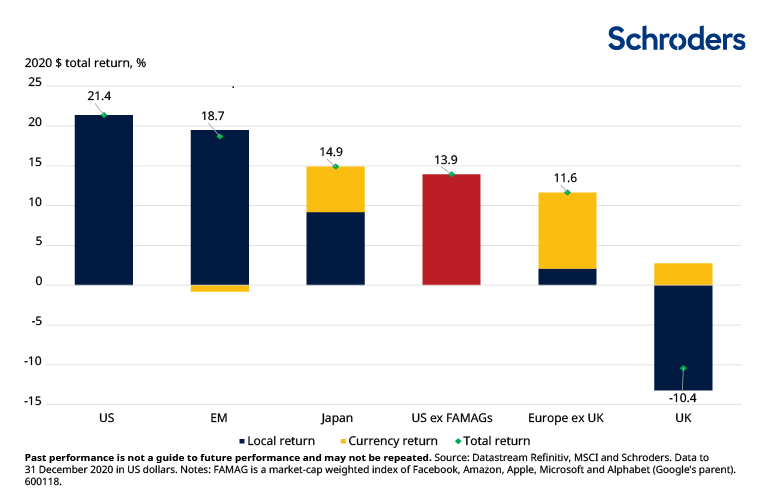 The MSCI All-Country World $ Index returned 16.8% in 2020, led by the US market, which was up 21.4%. US outperformance was heavily attributable to the increasing index concentration and rally in the Big Tech stocks – Facebook, Amazon, Microsoft, Apple and Google (Alphabet). We calculated that, without their contribution, US equities would have returned only 13.9% in 2020, behind EM equities (+18.7%) and Japanese equities (+14.9%). This is illustrated in the first chart below.