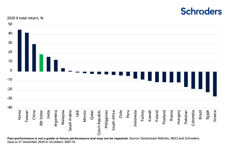 Concentration is not unique to the US but also extends to the EM universe. Only 7 out of the 27 countries in the MSCI EM Index posted positive returns in 2020, highlighting the narrowness of the EM rally. Stand-out markets included South Korea (+42.7%), Taiwan (+42.0%) and China (+29.7%). Their effective response to contain Covid-19 helped their economies to return to a degree of normality comparatively better than the rest of the world, sending their stock prices higher in the process.