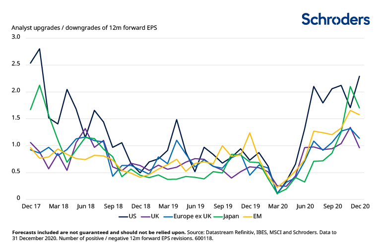For example, for the month of December, the US led the pack, with more than twice as many upgrades as downgrades. Positive sentiment is also reflected in Japanese and EM equities, which recorded 50-70% more upgrades than downgrades. Meanwhile, European equities trailed significantly behind with only 13% more upgrades than downgrades while analysts covering the UK were relatively neutral.