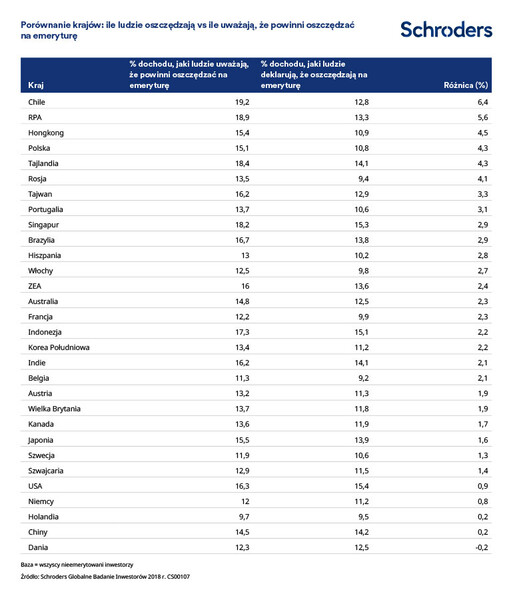 Różnica pomiędzy tym, ile ludzie oszczędzają a tym, ile uważają, że powinni oszczędzać była największa w krajach rozwijających się. Na przykład Chilijczycy aktualnie oszczędzają 12,8% swojej bieżącej pensji, ale uważają, że powinni oszczędzać 19,2% - różnica wynosi 6,4%.